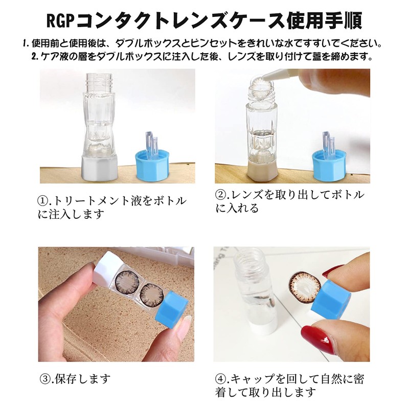 - 【左右のマーク】帽子ごとに左右のマークがついています。色で表記しやすいように。これはもうあなたのハードコンタクトを混乱させません。レンズケースの蓋を外して、レンズを容器に入れてください。これはレンズを持ちやすいようにします。また、彼らは同じところに組み立てることができます。