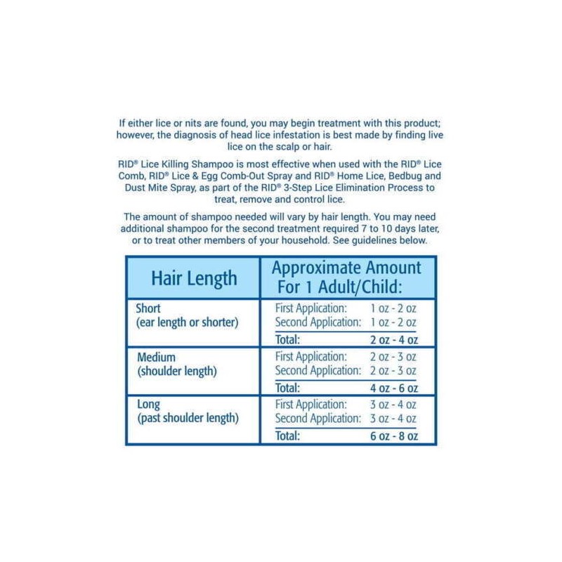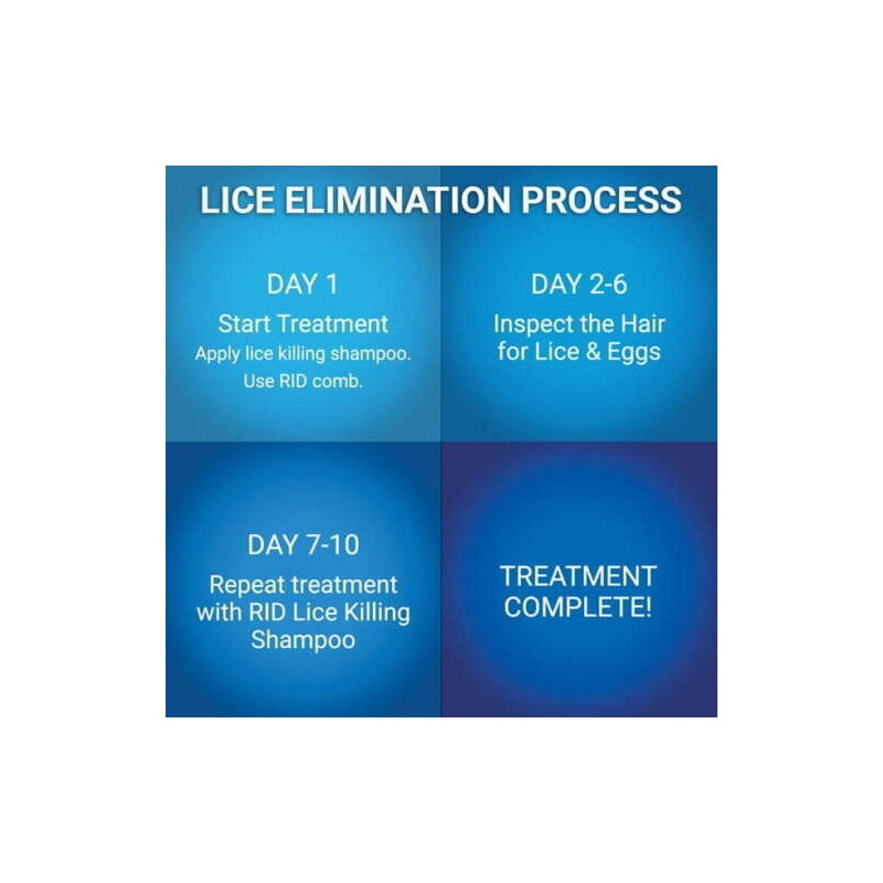 - Repeat with a second treatment of RID Lice Killing Shampoo 7-10 days later.