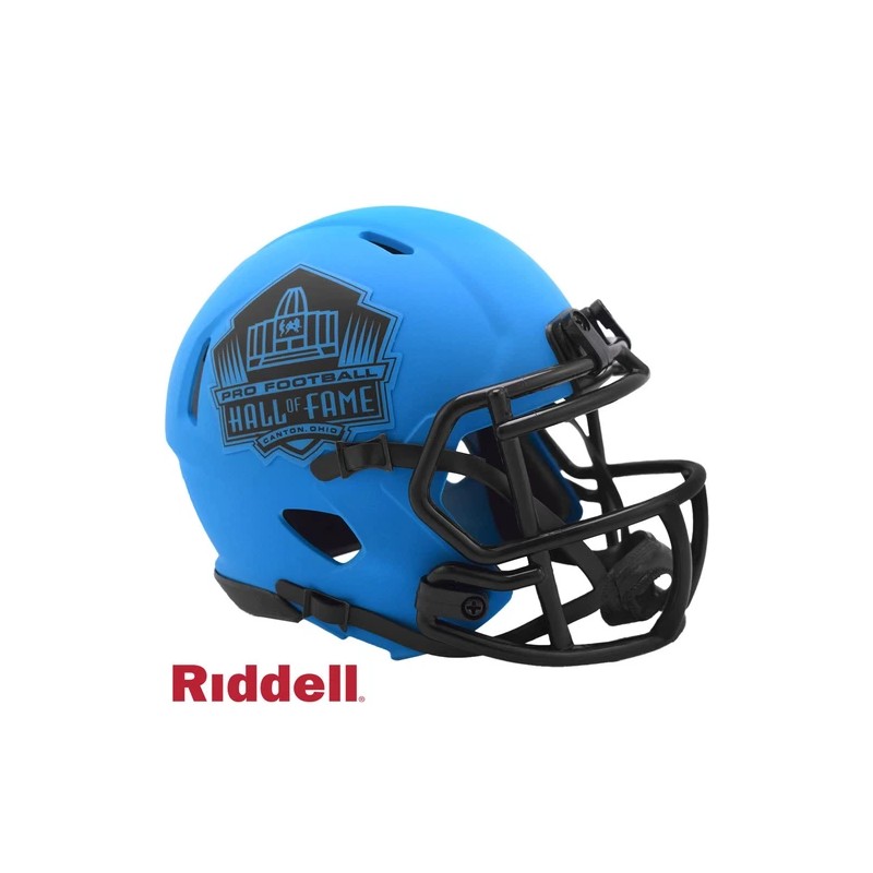 The Rave Collection puts a bright and colorful spin on NFL helmet design. Each helmet features brightly colored matte-finish shells, Matte one-color logo treatments matching the matte-finish shell and all black parts (facemask, chinstrap, buckles, padding, and bumpers). Based on one of the most popular on-field designs, this collectible Speed Mini football helmet is made specifically for fans of the Hall of Fame. At approx. 5.5 in. tall, this half-scale display helmet is perfect for all football fans and great for autographs. The helmet features a mini size Speed shell, the S2BD-SW-SP face mask and a 4-point chinstrap. The perfect collectible or gift!