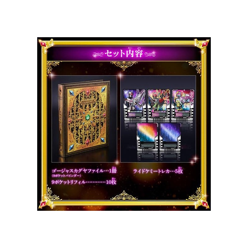 Introducing the Ride Chemy Reca Gorgeous Saguya File, which reproduces the card files made by Hogokura Kaguya Quartz in Kamen Rider Gatchard! This gorgeous Saguya File, which appeared in Kamen Rider Gatchard, is now available as a 9-pocket card file that can be used to store the Legend Rider Chemy Card. The gorgeous Saguya File has been treated with cold foil to reproduce the shine of the movie, and it is varnished for a three-dimensional look. Kaguya's attention to detail is made to make you feel gorgeous. In addition, this product comes with 5 ride chemy train cards with an original design. This lineup includes 1 Legend Ride Chemy Reca from Legend Rider, Kamen Rider Poppy, Kamen Rider Charis, and 2 Blank Ride Chemy Trakas with different designs. Just like the props in the movie, it is a gorgeous specification equivalent to the Super Rare from the Ride Chemy Treka series. With the included 9-pocket refills, you can store up to 180 cards in the Ride Chemy Train Series (sold separately). With the same lineup as seen in the movie, you can set the Legend Ride Chemy Reca and enjoy your collection as Kaguya.