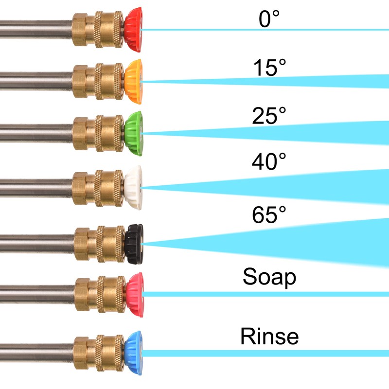 7 puntas de boquilla tienen diferentes ángulos. Reemplaza la boquilla de acuerdo con la necesidad real de obtener diferentes patrones de pulverización. Conveniente accesorio plug and play para la mayoría de marcas de lavadoras a presión.