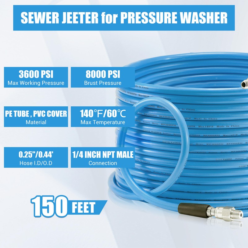 - DURABLE ABRASION RESISTANT MATERIAL: High power sewer jetting is made from high-quality materials for long-lasting durability. power washer drain jetter's surface is highly wear-resistant, preventing leaks and damage. With a working pressure of 3600 PSI, burst pressure of 8000 PSI, and a max temperature is up to 140°F, sewer jet nozzle kit ensures reliable performance and safety during use