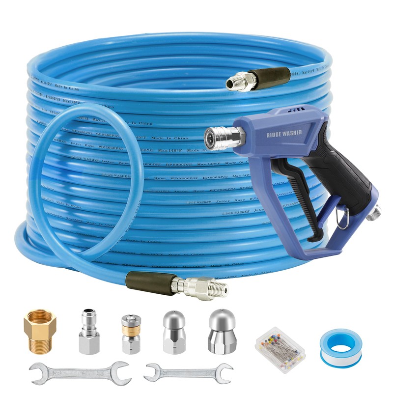 RIDGE WASHER Sewer Jetter Kit for Pressure Washer 150FT, 3600 PSI Drain Cleaning Hose with Short Power Washer Gun, 1/4 Inch NPT Corner, Rotating and Button Nose Sewer Jetting Nozzle