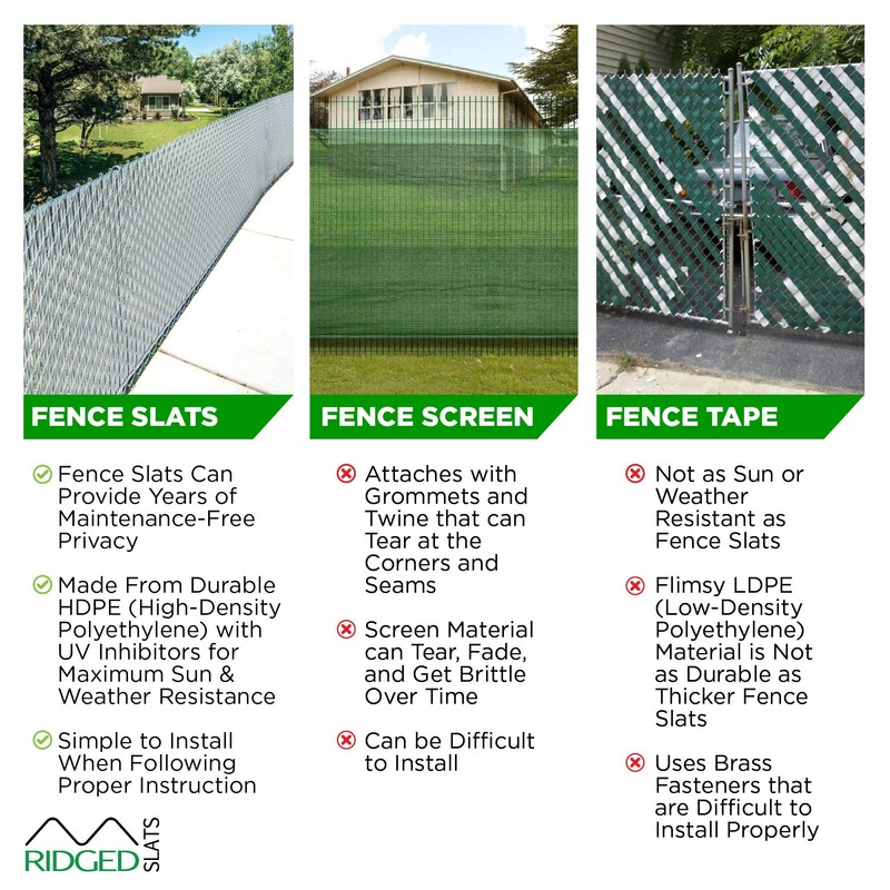 - Single wall bottom lock Ridged Slats provide the most privacy for the money compared to other vertically inserted slat designs. This wider extrusion uses less material allowing us to package more slats in a smaller box to protect the slats and reduce shipping costs. This makes Ridged Slats a more affordable option for homeowners, schools, colleges, businesses, stadiums, storage facilities, etc. Slats are a permanent addition to fence that lasts much longer than wind screen or privacy tape.