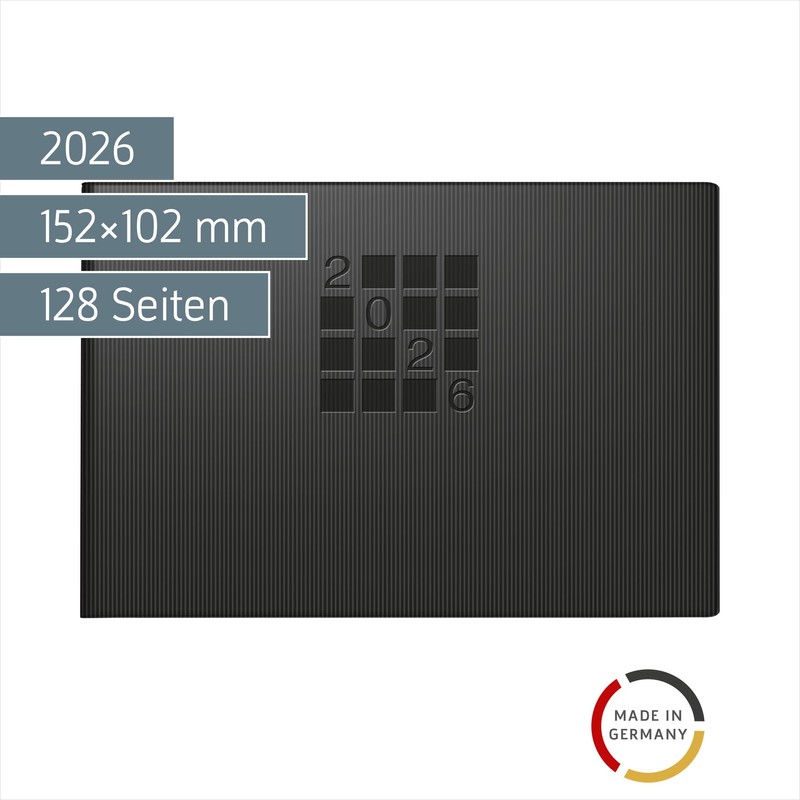 - Linea paper cover, colour: black, year overview current year and following year, 6 pages monthly plan following year, holiday dates Germany, 10 pages worth knowing, interchangeable address book, 16 pages