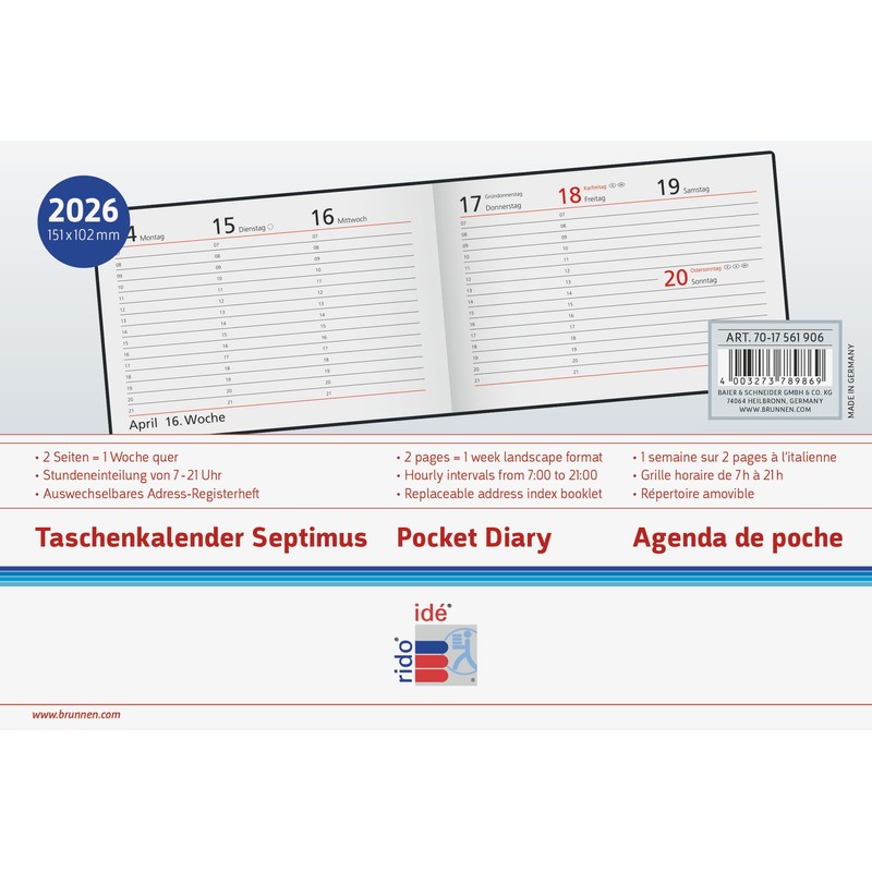 rido/idé Pocket Calendar Model Septimus '26 | A6 Landscape Paper, Black