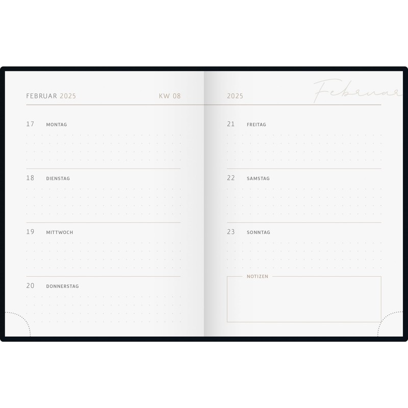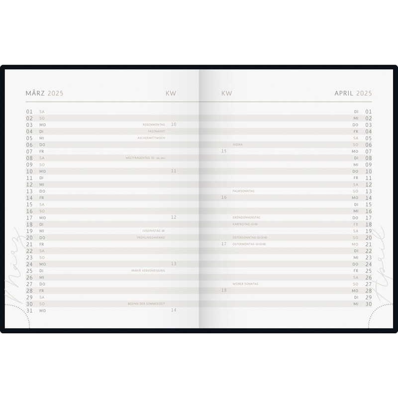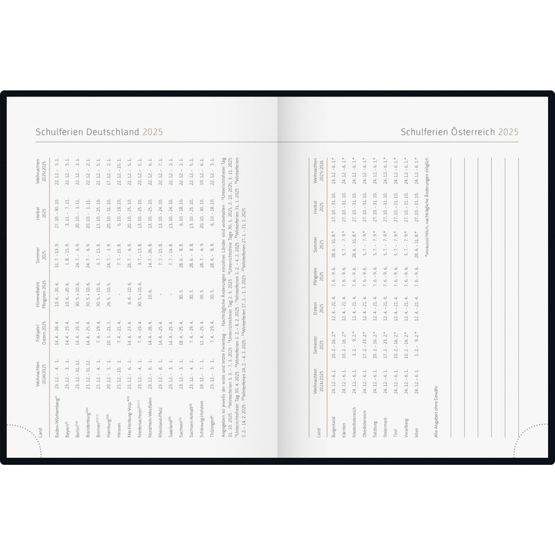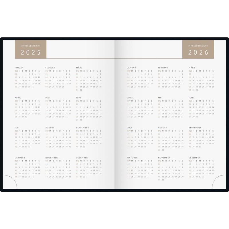 - Annual overview current year and following year, 12 pages monthly plan current year, 6 pages following year, 16 pages notes