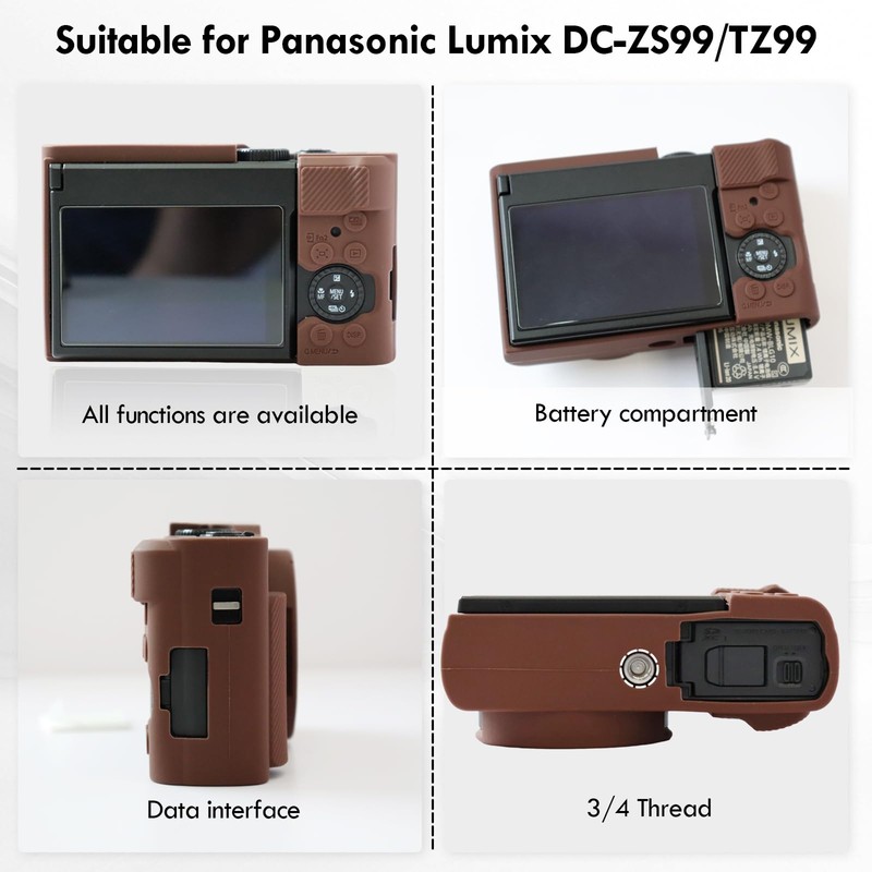 - Precise Fit: Panasonic Lumix DC-ZS99 case, 1:1 molded from actual camera for snug fit. Pre-cut for buttons, HDMI/USB-C ports, 1/4" tripod screw hole.Direct access to battery compartment, easy lens cap removal, unrestricted LCD flipping.