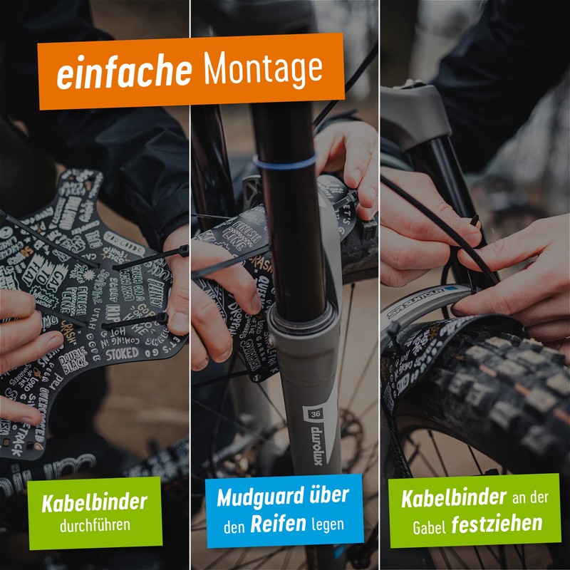 - Large range of applications: the mud guards from Riesel Design can be used as mud flaps for the entire MTB range (XC, marathon, tour, trail, all mountain, enduro and freeride) as well as a downhill mudguard. Supported wheel sizes: 16", 20", 24", 26", 27.5", 27.5+, 29".