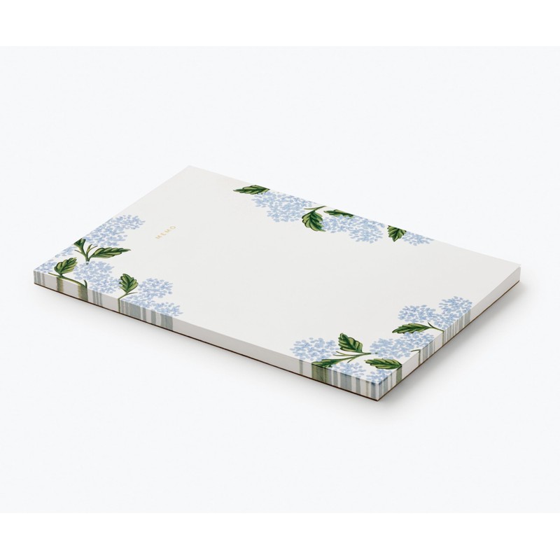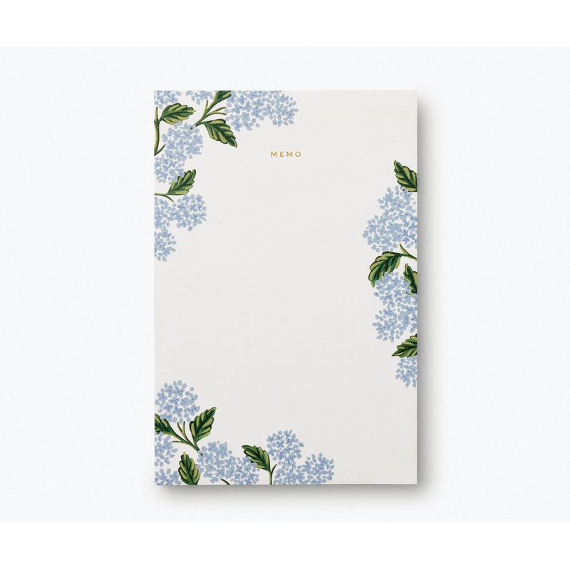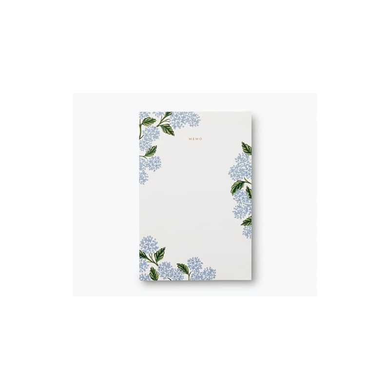 • BRIGHT, BEAUTIFUL DESIGN: The Rifle Paper Co. Large Memo Notepad, 9" L x 6" W, allows you to make even mundane memos look motivating. The pad features 65 tear-off sheets with metallic foil writing and graceful, blooming hydrangea designs. This notepad will make organizing your tasks fun!
