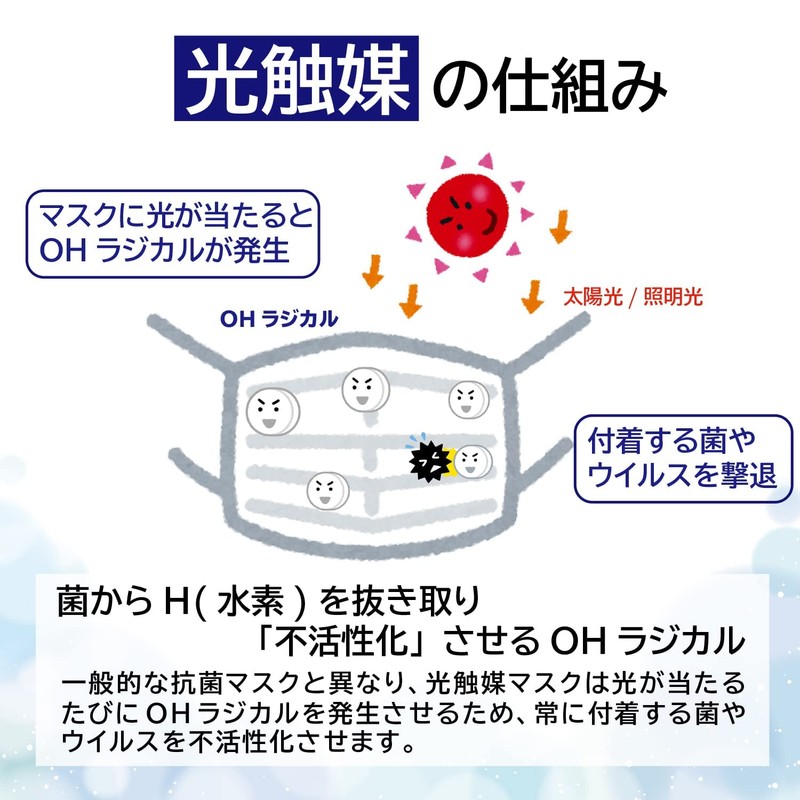 - This highly functional non-woven mask can be sterilized, disinfected by light (LED, fluorescent light, sunlight, etc.) This mask is made by professional rifveil with photocatalyst (LED catalyst) coating, and is made with a photocatalyst coding mask that is safe for children and children