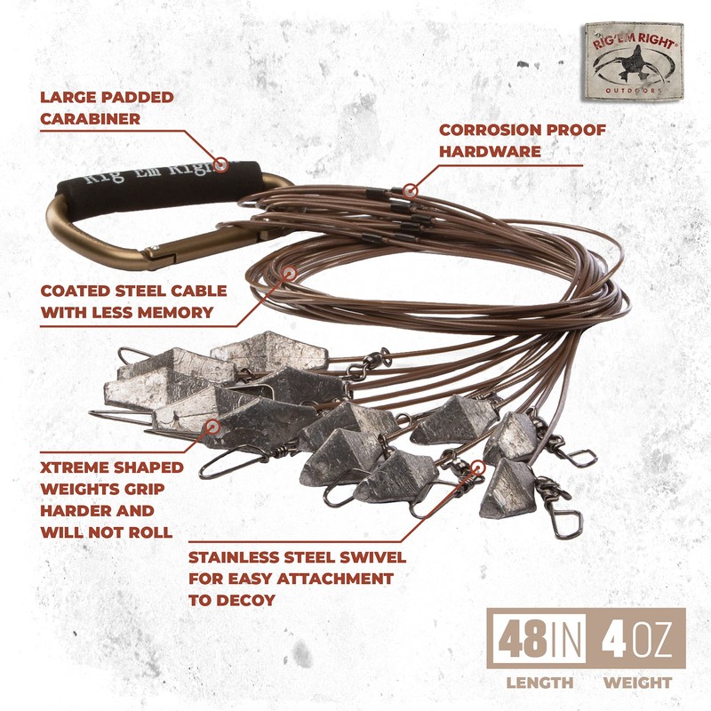 Rig'Em Right Waterfowl Pre-Rigged Xtreme Coated Tangle Free Cable Duck Hunting Decoy Anchors (48" Length, 4-oz Weights)