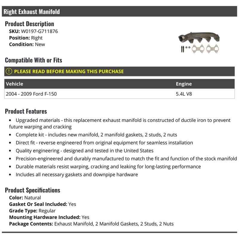 - Upgraded materials - this replacement exhaust manifold is constructed of ductile iron to prevent future warping and cracking