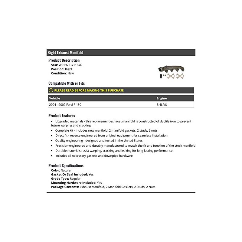 Right Passenger Side Exhaust Manifold with Manifold Gaskets Studs and Nuts - Compatible with 2004 - 2009 Ford F150 5.4L V8