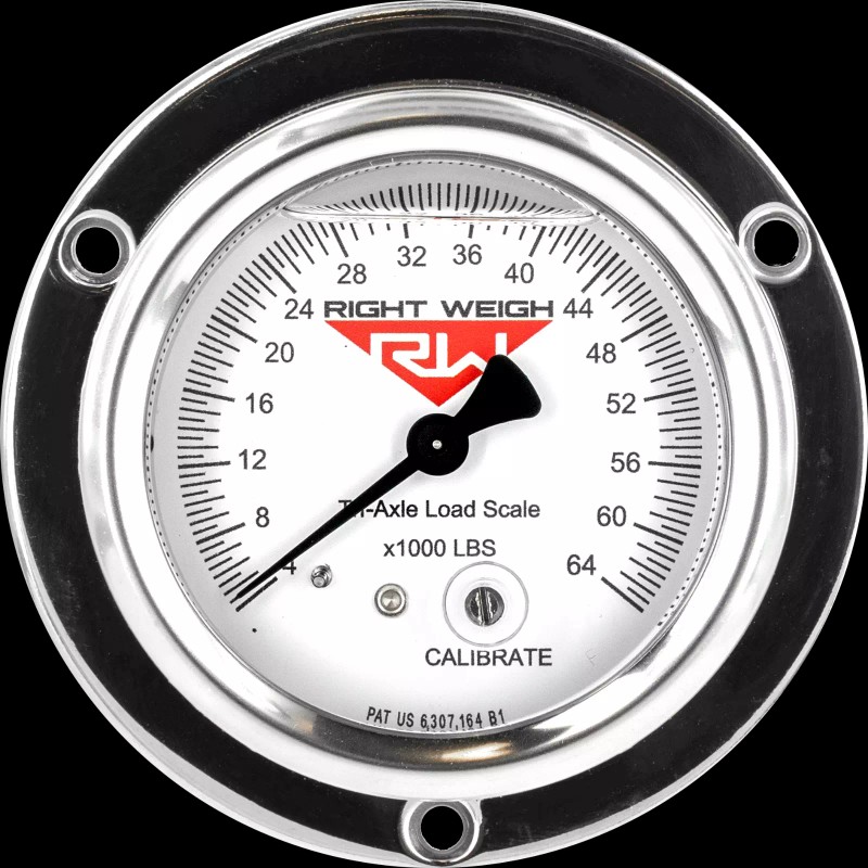 Our 250-64-FF Liquid-Filled Exterior Mechanical load scale is designed for a tri-axle suspension group with one height control valve.  After a loaded calibration at a certified ground scale, the gauge will reliably display the on-the-ground axle group weight in pounds. When properly calibrated and used, Right Weigh on-board load scales are the most valuable tool available for maintaining safe and legal axle weights.
