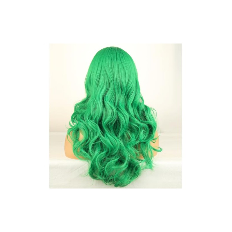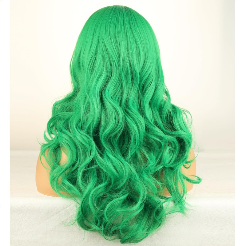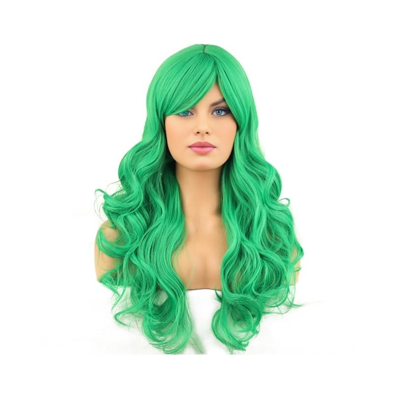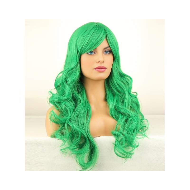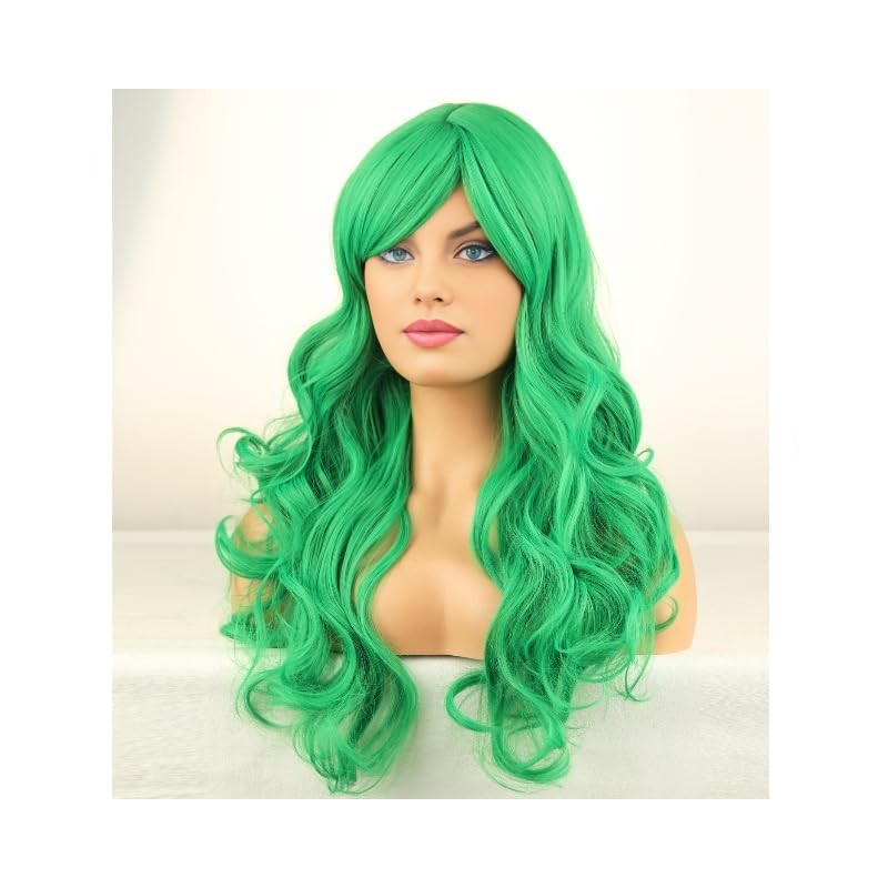 RightOn Green Wig Long Curly Green Wig with Bangs for Women Daily Party Hairnet Include