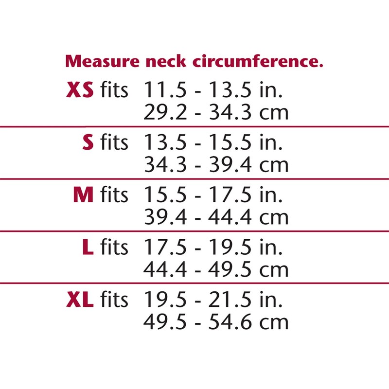 • Measure from sternal notch to mandible. Available in three depths: narrow 2.5", average 3", wide 3.5"; sizes: X-Small (11.5-13.5"), small (13.5-15.5"), Medium (15.5-17.5"), large (17.5-19.5"), X-Large (19.5-21.5")