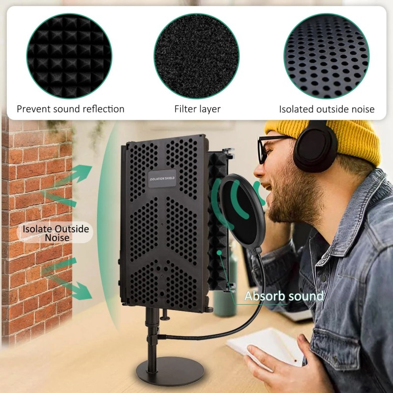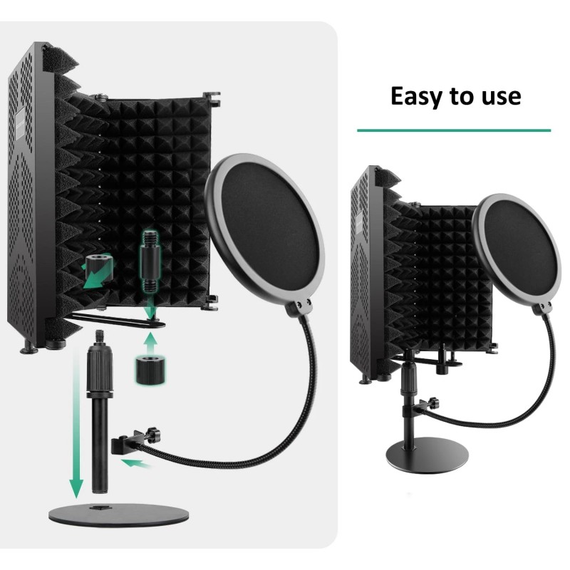 This mic shield that consists of 3 panels together and it's free to adjust the angle, the compact and foldable design makes it easier for you to carry it around you.