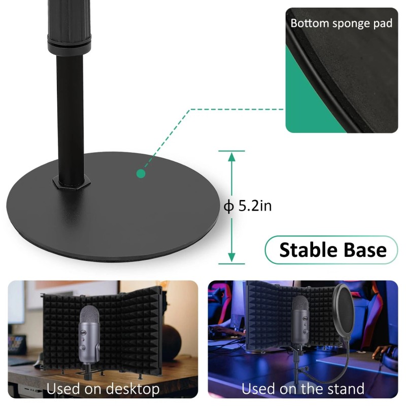 Desktop Mic Stand - The mic stand with isolation shield has a new upgrade metal weighted base which makes it more sturdy and stable. Metal base with bottom sponge pad, that moving the desktop microphone stand without causing any noise and leaving any scratches on the table.