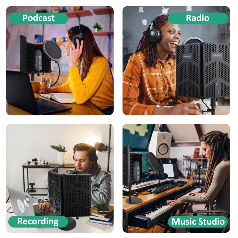 This foldable mic shield is Great for professional vocal/acoustic recording and podcasting sound booth. The inner side of the microphone isolation shield is made of high quality acoustic sound absorbing foam that can reduces noise and preserve the clarity of your voice and instrument sound, while eliminating audio wave bounce back and interference.
