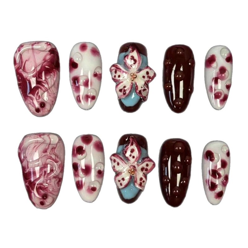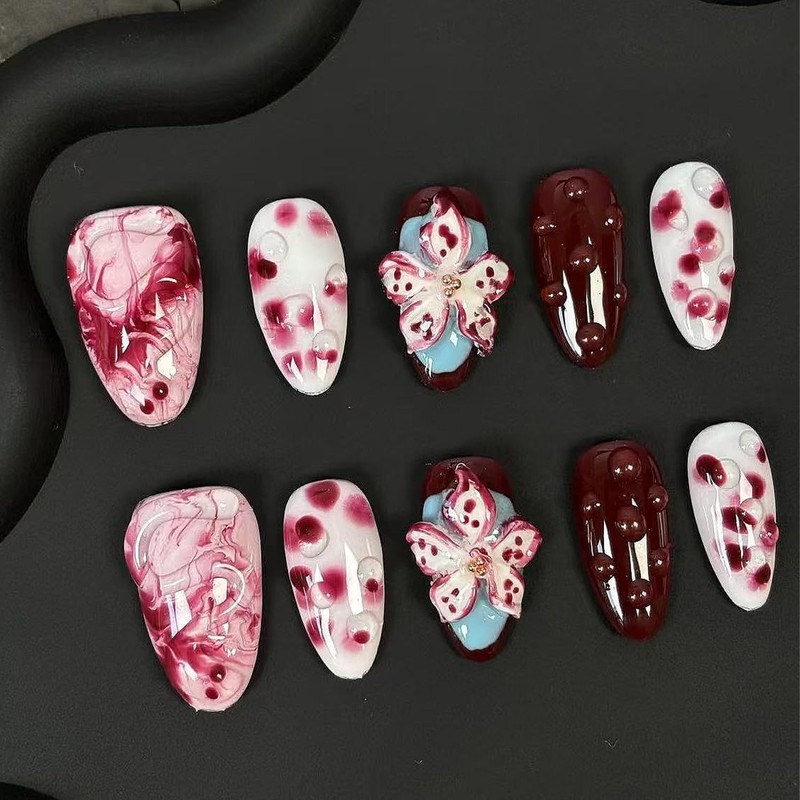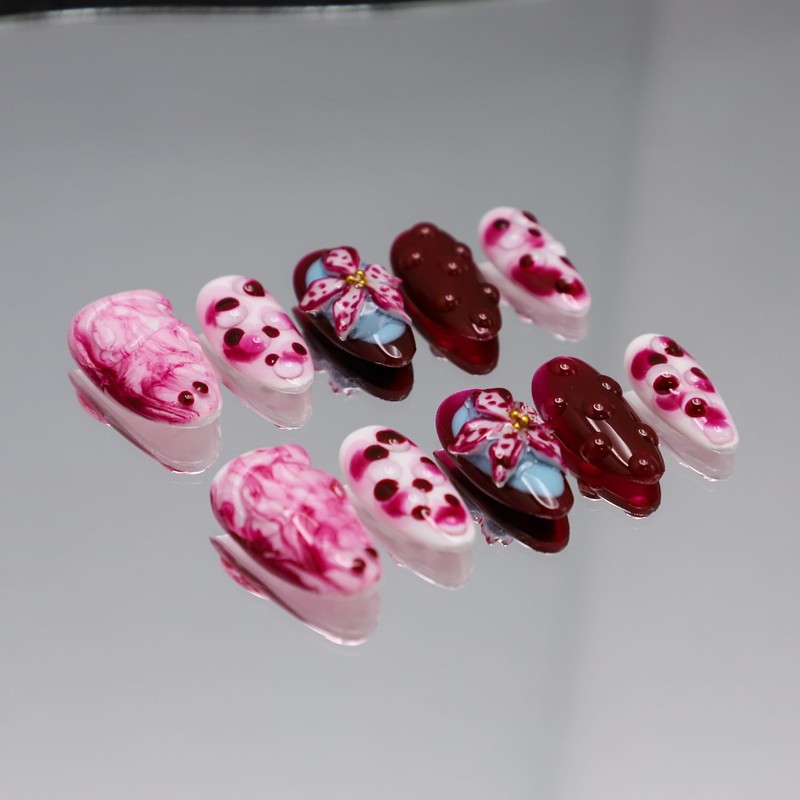 RIICFDD Handmade Press on Nails Medium Almond Fake Nails with Glue,Tropical Flower Nails with 3D Lines Designs Wine Red Acrylic Nails Nature Stick on Nail False Nails for Wome (Size M)