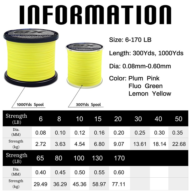 1、"RIKIMARU 8X PRO BRAID"is designed for professional anglers. 2、The 8X PRO is braiding from 8 Strands of UHMWPE ultrafine fiber.And it uses the braiding technique of 36 crosses per inch, which makes the BRAID tighter and stronger. 3、Its surface will be rounder and smoother, so it will make your casting easier and farther. 4、The colors fluo-green, Lemon Yellow and Plum Pink are more active and attractive.The A-b dyeing technology can better limit the loss of color.