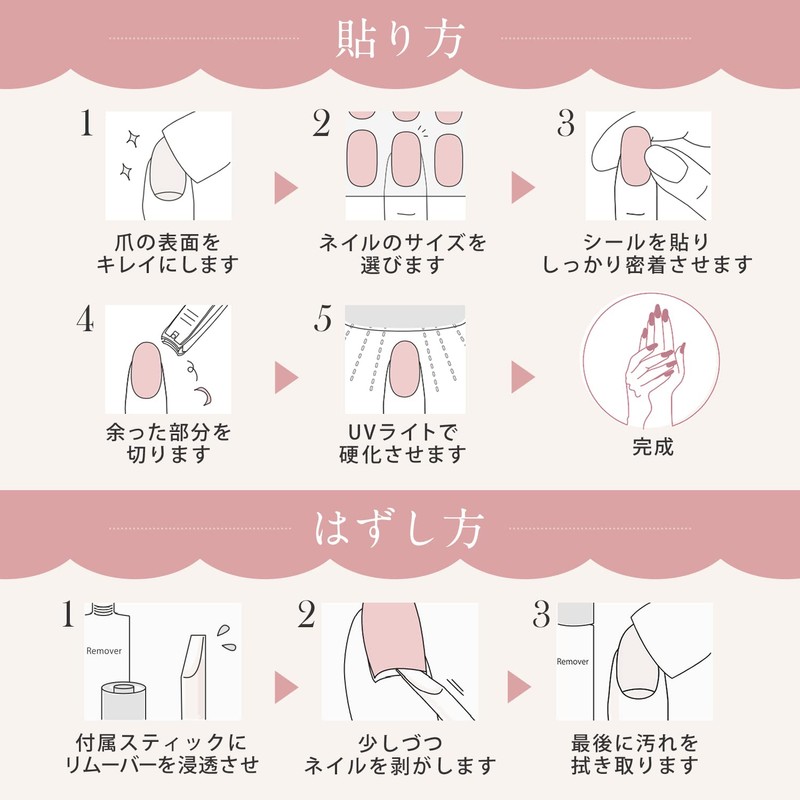 You want to go to the nail salon but don't have time to pass it high and often. The hardened gel nail seal is perfect for those problems. Just stick the sticker size according to your fingernail, and place the UV light for 60 seconds. Enjoy salon-grade quality at home. The design is pre-painted on the sticker, so you can stick it on and make it look stylish. The adhesive side of the nail is sticked, so you can easily turn it off without damaging your nails. You can easily enjoy stylish while wearing your own nails.