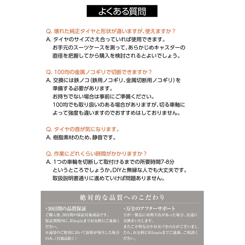 • Note: This product is not universal, so please check the dimensions of the caster before purchasing. Please note that returns and exchanges due to reasons that are not compatible even before use will result in a return or exchange for your convenience. Each attachment is consumables. ・We are not responsible for any problems or accidents encountered when using this product. We cannot accept returns or exchanges of products that have been processed or installed. Please check in advance. In addition, we cannot deal with the insurance of the product installation