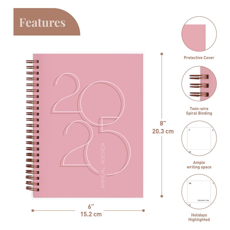 Rileys & Co 2025 Deco Weekly Planner - Annual Weekly & Monthly Agenda Planner, Jan - Dec 2025, Flexible Cover, Notes Pages, Twin-Wire Binding (15.2 x 20.3 cm, Pink)