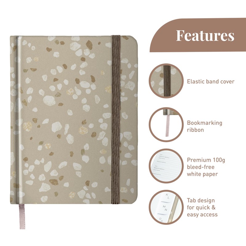 Rileys & Co. Compact Terrazzo Password Book | Alphabetized Tabs, Secure Login Organizer, Internet & Website Username Keeper | Portable and Convenient (Beige, 6 x 5 Inches)