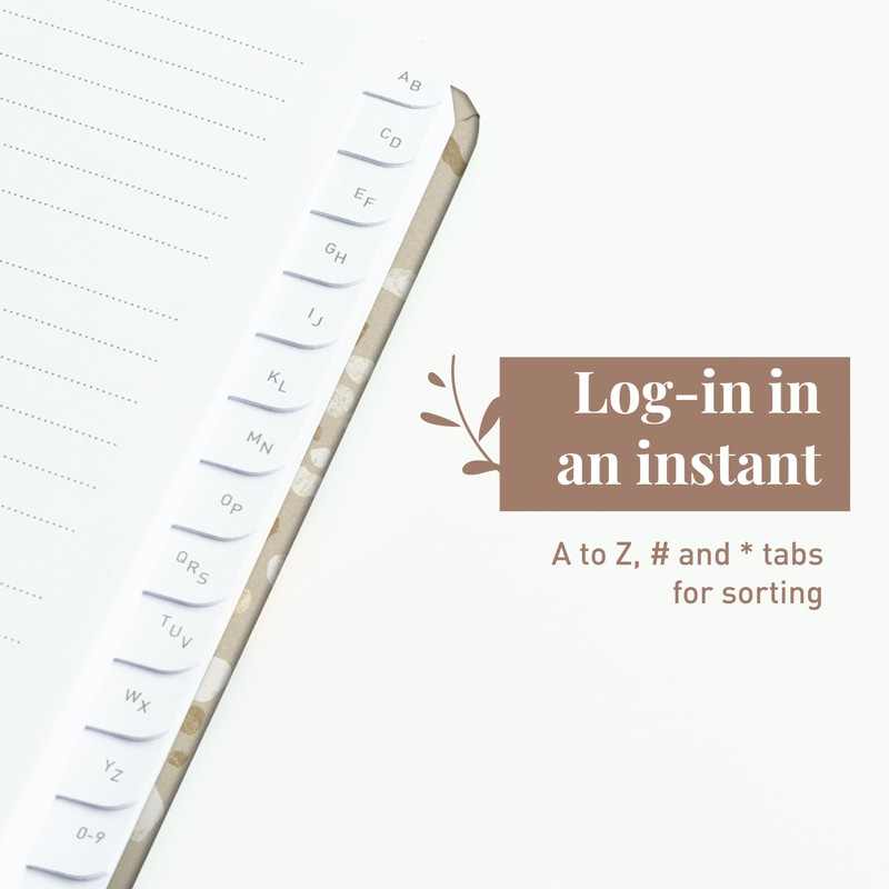 - EFFORTLESS ORGANIZATION: Designed with A to Z tabs, the Password Keeper Book swiftly organizes your online credentials. With a finger flick, you find passwords effortlessly, saving you valuable time and eliminating the frustration of searching through a cluttered list. The additional notes section lets you jot down vital information such as security questions, PINs, or other pertinent details about your online accounts.