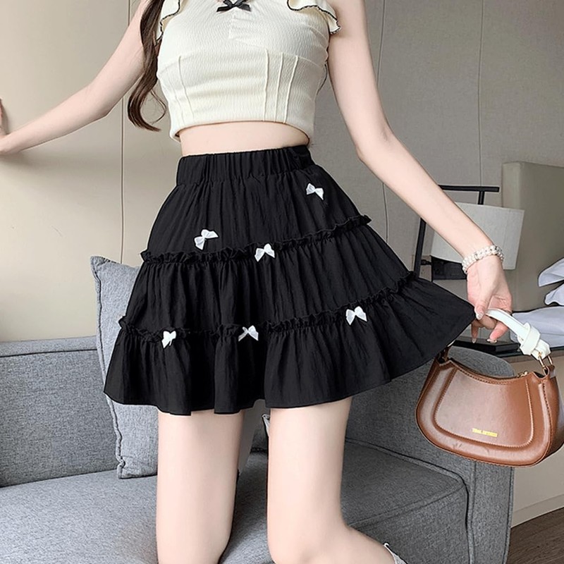 - Design: Harajuku fashion elastic waist a-line pleated short skirt with shorts underneath, with cute bows and lace trim. cute and casual style skirts for women.