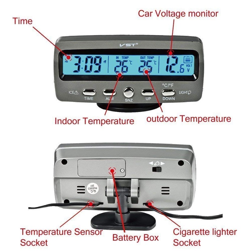 - Multi-function Design: : Displays time, indoor/outdoor temperature, and real-time car voltage simultaneously. Includes alarm settings and a frost alarm function.