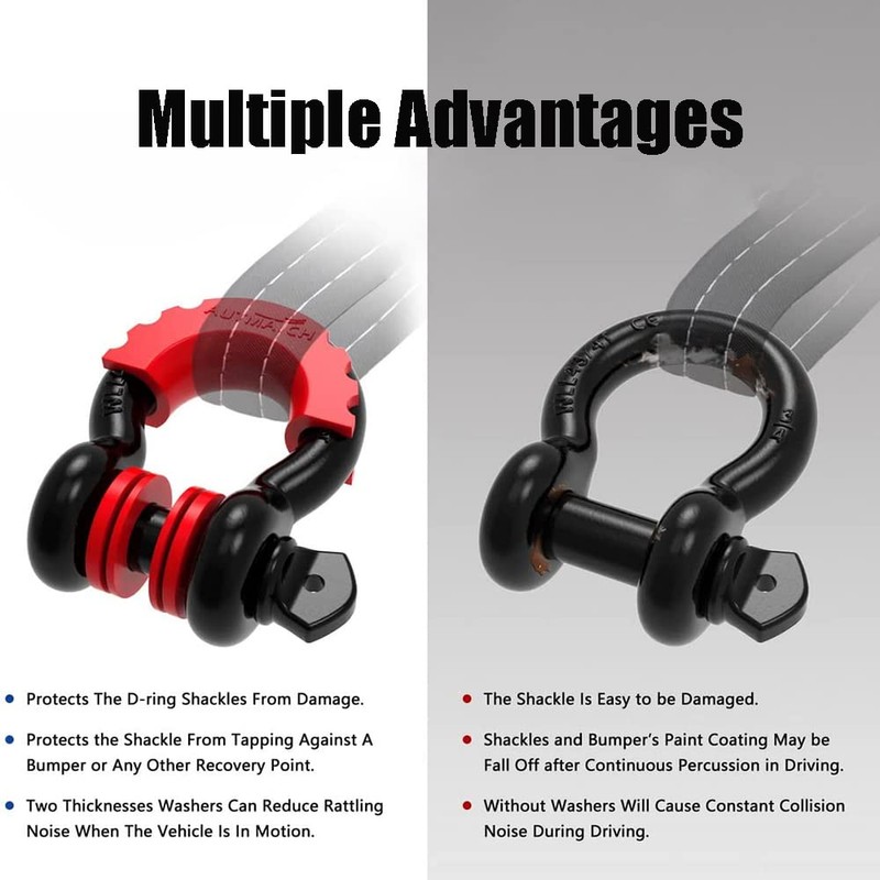 • Function: The shackle insulator is designed to reduce the rattling of the shackle against the anchor point, eliminate metal to metal contact and prevent damage to the bumper paint and minimise damage to cables and straps.