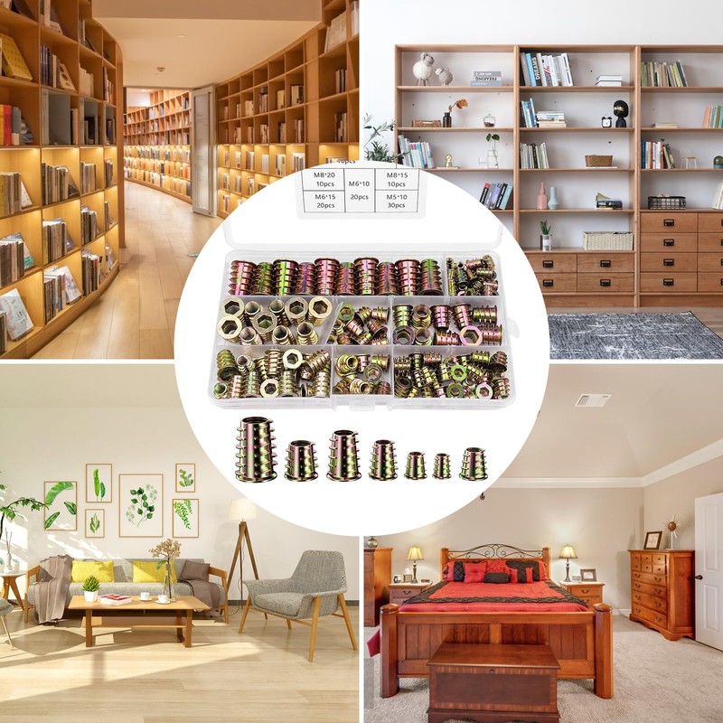 - Wide application: screw-in sleeves for wood are suitable for connecting wood and are mainly used in wooden furniture such as chairs, tables, wardrobes, shoe cabinets, etc. as well as other decoration projects.