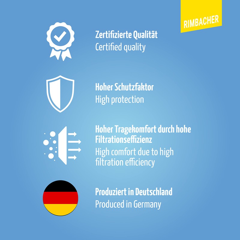 • RIMBACHER quality promise, made in Germany. Our respirator masks are manufactured in Germany to the highest quality standards and tested and certified by accredited testing laboratories.