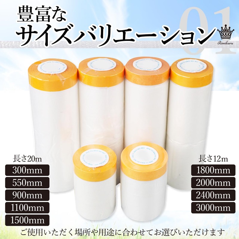 • 豊富なサイズバリエーション:こちらのテープ付き養生シートは幅300mm・550mm・900mm・1100mm・1500mm・1800mm・2000mm・2400mm・3000mmをご用意しましたので、ご使用いただく場所や用途に合わせてお選びいただけます。