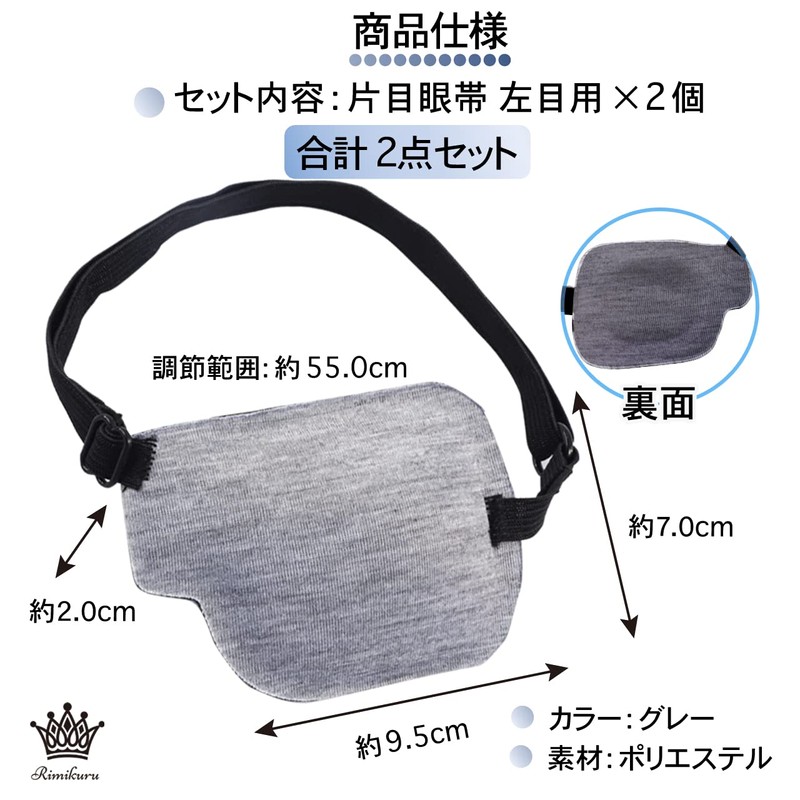 - [Product Specifications] Set Contents: Single eye patch x 2, Total 2-piece set. Color: Gray; Size: Approx. 3.7 x 2.8 x 0.8 inches (9.5 x 7.0 x 2.0 cm). Strap adjustment range: Approx. 21.7 inches (55.0 cm). Material: Polyester. *Depending on your monitor settings, there may be slight differences in the viewing conditions