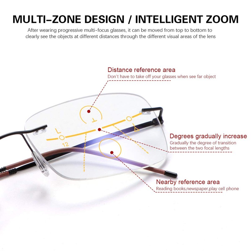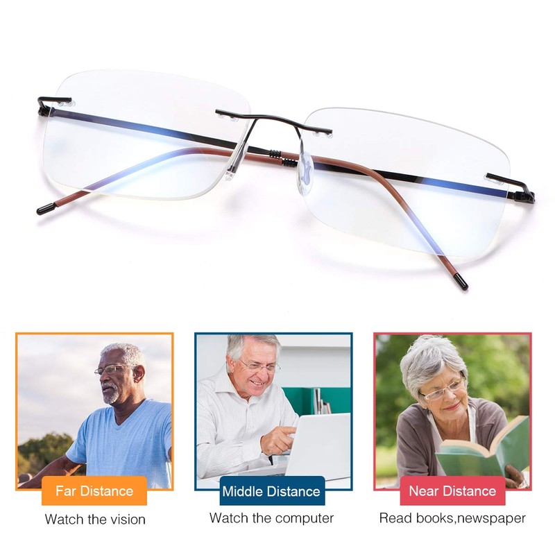 - Package Included - 1* Rimless Pregressive Multifocal Reading Glasses, 1* Glasses Cleaning Cloth, 1* Glasses Case , which can be a exquisite gift sending to your families and friends. If you have any problems with our reading glasses, please contact with our customer services without hesitation. We will provide the best solutions until the customer is satisfied.