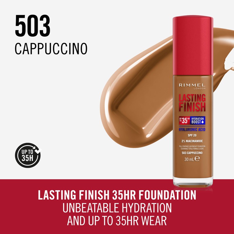 Rimmel Rimmel Lasting Finish 35Hr Foundation 503 Cappuccino, Full Coverage, Hydrating, SPF20, Hyaluronic Acid, Vitamin E, 2% Niacinamide, All Day Wear, Vegan, Cruelty Free