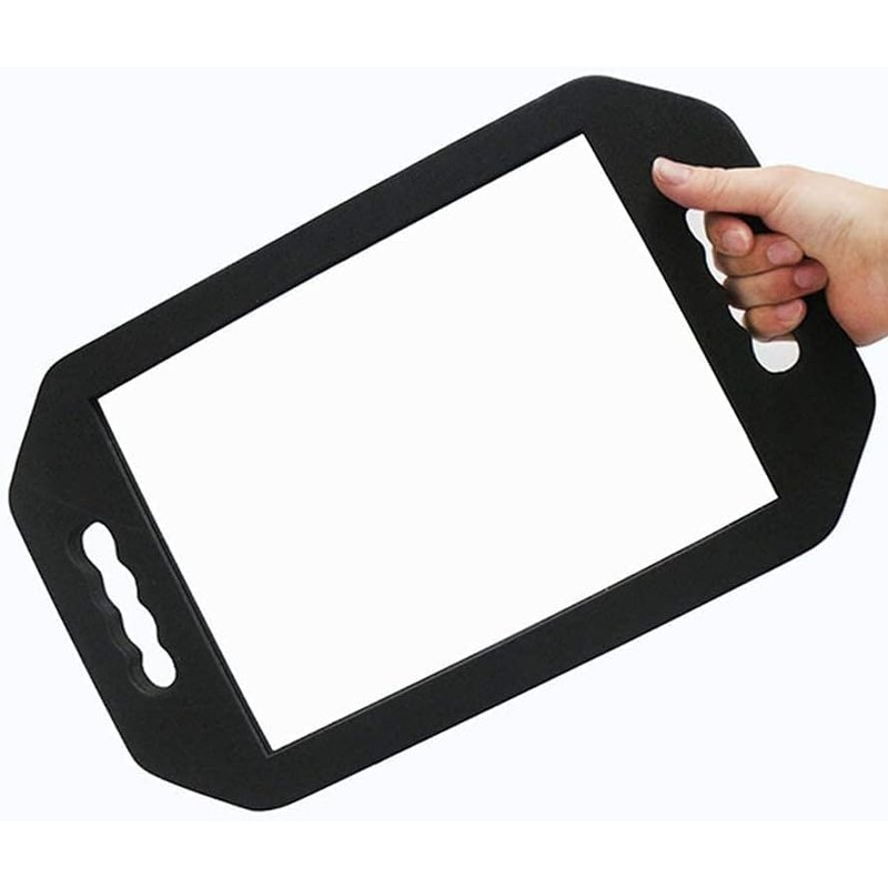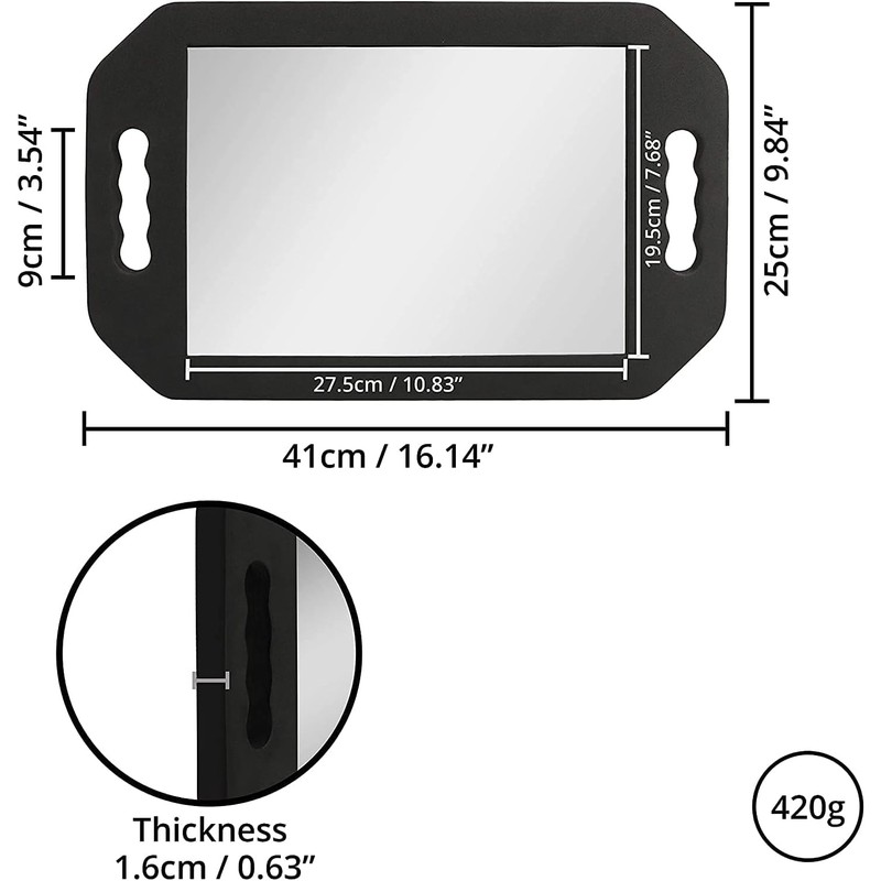 DOUBLE HANDLED LARGE RECTANGULAR MIRRORThe two handles make it easier to hold and will allow you to show your client their new style or hair cut from all angles.FOR USE BY BARBERS, HAIR STYLISTS OR PERSONALLY AT HOMEPerfect for use by hair stylists and barbers as well as at home for self hair cutting and styling.What's Included:1 x Rectangle handheld hairdressing mirror.Dimensions:Overall size of the mirror measures: L41 x W1.6 x H25cm (16.14 x 0.63 x 9.84 inches).Mirror portion measures: 27.5 x 19.5cm (10.83 x 7.68 inches).Mirror weighs: 420 grams.Handles measure: 9cm (3.54 inches).Professional-Grade Accessory: our distortion-free salon-grade mirror will offer you or your workers the versatility and peace of mind you need in a professional environment.