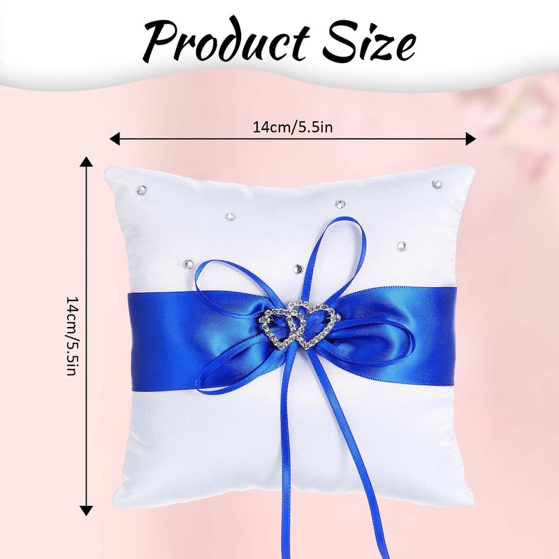 Ring Cushion Wedding Registry Office, Heart Rhinestones White Ring Cushion for Wedding, Ring Bearer Cushion Wedding Ring Cushion with Blue Beautiful Bowknot for Wedding Ceremony Proposal 14 x 14 cm