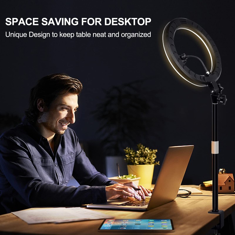 - 【HEIGHT ADJUSTABLE & SPACE-SAVING】This vdieo conference light comes with a metal clamp to attach it to your desk, Stable and frees up lots of desktop space,The clamp mount is adjustable for fitting kinds of flat desktop with MAX THICKNESS of 2.1 inches. The mount stand is much higher than other desk stands, which could be extended from 14.2 in to 24 in, so you never have to worry about the ring light being covered by your computer monitor.