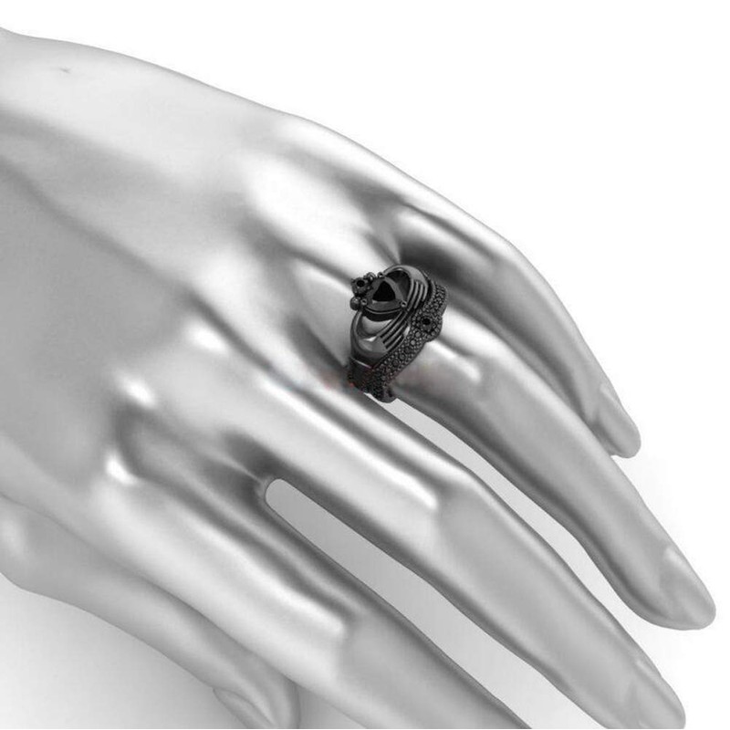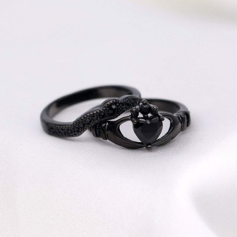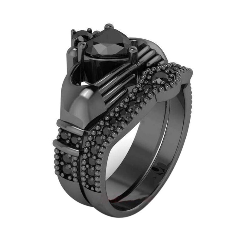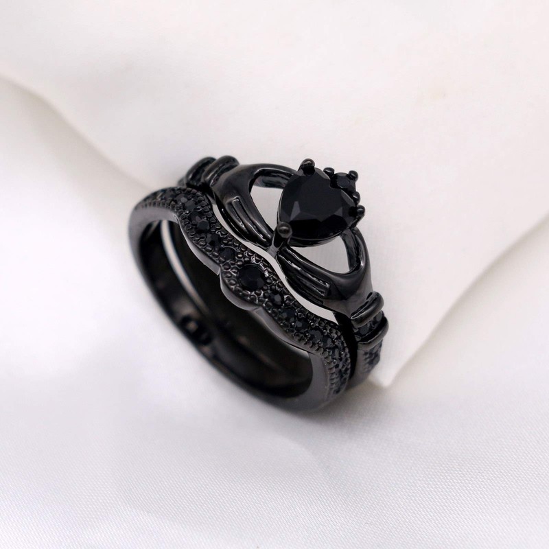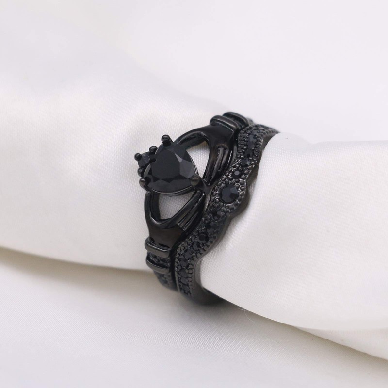 ringcrown Bridal Sets Black Gold Plated Heart Black Cz 2pcs Womens Wedding Ring Sets Engagement Ring Claddagh Ring
