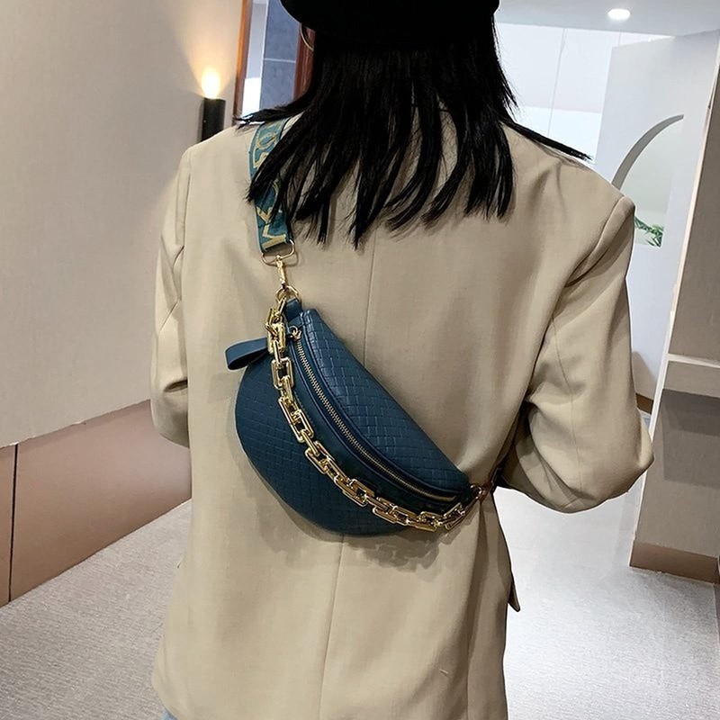 Riñonera de piel a cuadros para mujer, de cadena gruesa, bandolera de lujo, para el pecho, Azul, Pequeño, Classic