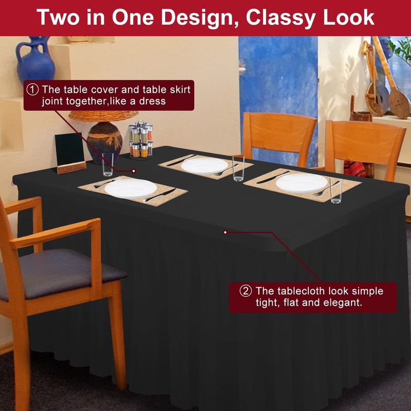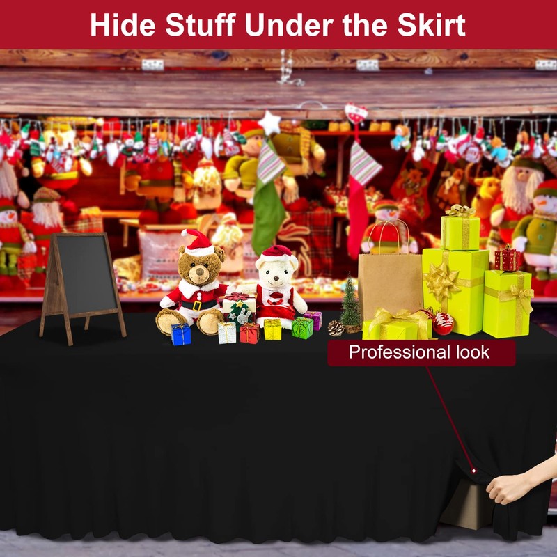 - [ELEGANT AND PROFESSIONAL LOOK] The flowy pleated skirt will add an elegant touchy for your decorations. The spandex tablecloth with skirt covers the top to the bottom of the table keeping it looking classy. Extra supplies can be hidden under the table. It is perfect for weddings, banquets, parties, baby showers, holiday parties, trade shows, vendor events, craft and art market...etc.