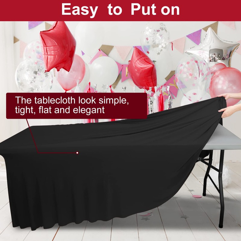 - [EASY TO PUT ON] Thanks to the weight of thickened fabric and good elasticity, the spandex table skirt has a good hang down feeling and easy to put on. Just stretch the tablecloth over the table like a glove, you can see the ruffles taking shape and a classy skirt coming out. No clips or fasteners needed. The spandex table cloth fits closely with the table and will not be messy even in the wind.