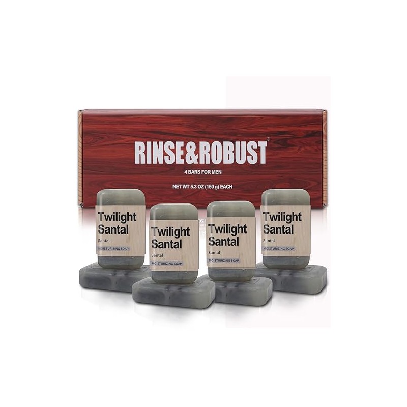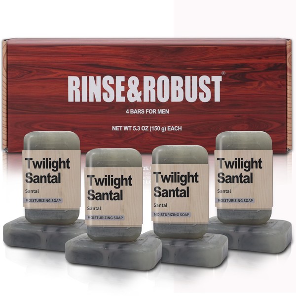 Rinse & Robust Men's 4-in-1 Exfoliating Bar Soap Gift Set - Moisturizing, Acne Relief for Face, Body & Shaving | Natural 4-Pack (5.3 oz Bars), Santal Scent