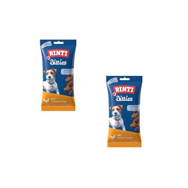 Rinti Bitties Huhn + Käse | Doppelpack | 2 x 75 g | Snack für ausgewachsene Hunde | Extra weich | Ohne Zucker & Soja | Mit wertvollem Omega 3 | Viel frisches Fleisch