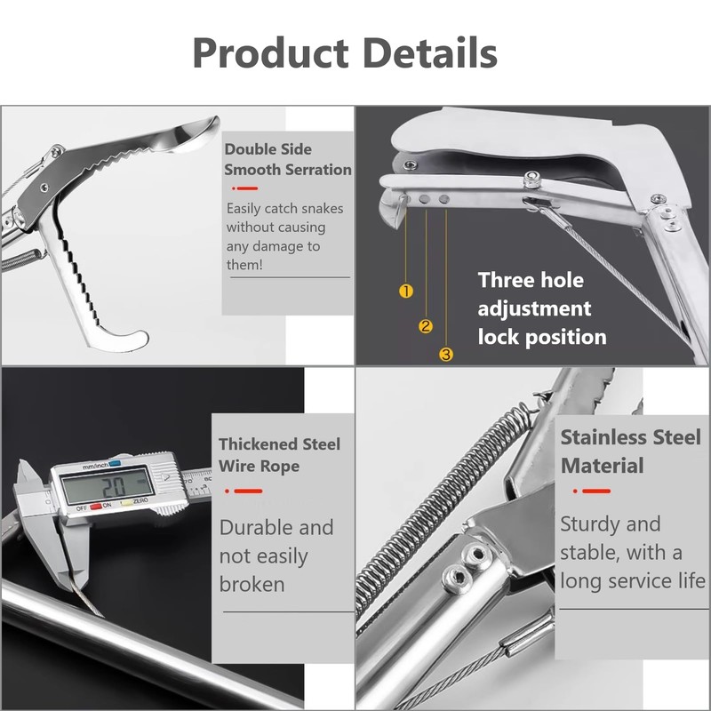 - Smooth Serrated Open clamp: Specially designed for snake catching, can easily and quickly catch different sizes of snakes or other reptiles without letting them escape, at the same time, the smooth serrations are also hard to cause harm to reptiles!